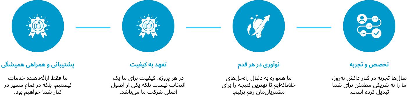 ما در کنار مشتریانمان میایستیم، از ایده تا اجرا، و تلاش میکنیم تجربهای مطمئن، حرفهای و الهامبخش رقم بزنیم. چون باور داریم رشد واقعی، زمانی اتفاق میافتد که موفقیت شما، موفقیت ما باشد.